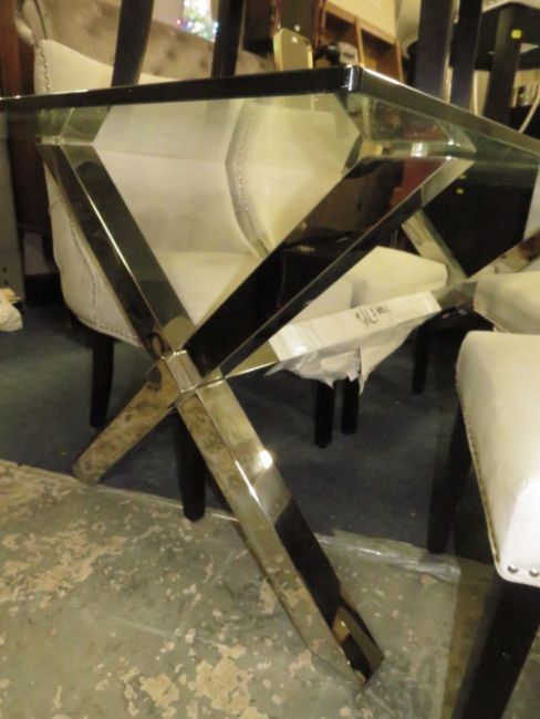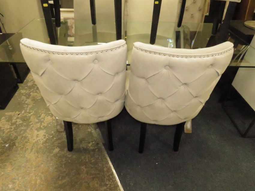 A LARGE MODERN GLASS TOPPED TABLE WITH SIX UPHOLSTERED CHAIRS