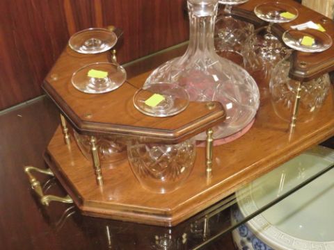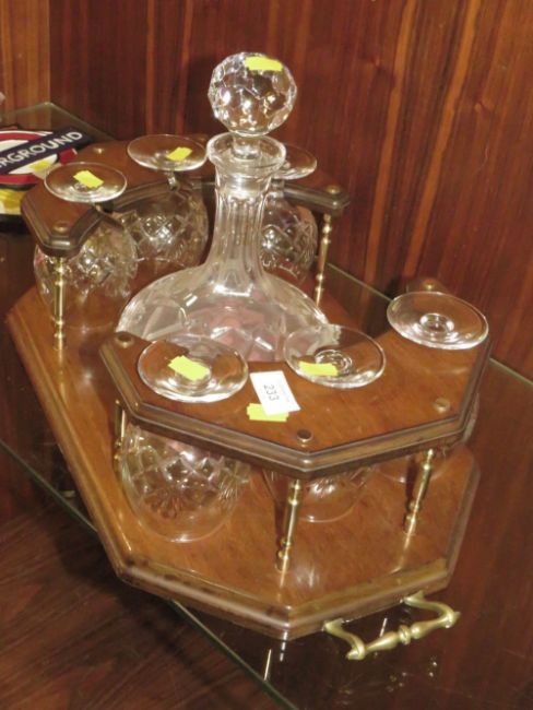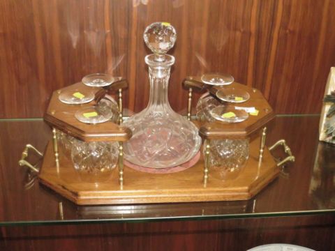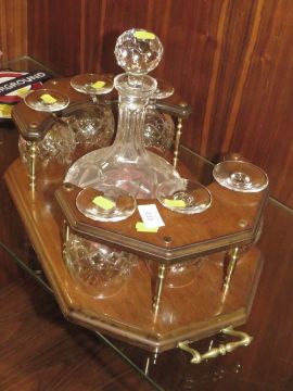 A TWIN HANDLED DRINKS STAND WITH DECANTER AND SIX BRANDY GLASSES