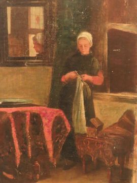 N. BISSCHEPS (XIX). Continental school, interior scene with young woman, signed lower right, oil on canvas, unframed, 26 x 17 cm