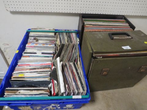 A TRAY OF 7" SINGLE RECORDS TO INCLUDE MOSTLY 1980'S TOGETHER WITH TWO CASES OF LP RECORDS