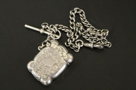 A GENTS ANTIQUE SILVER POCKET WATCH ALBERT CHAIN AND SILVER VESTA