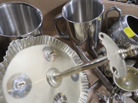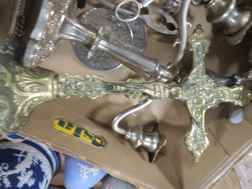 A TRAY OF ASSORTED METAL WARE TO INCLUDE A CRUCIFIX ON STAND ETC
