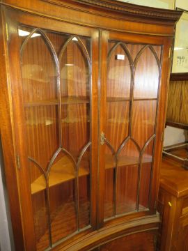 A REPRODUCTION MAHOGANY CONCAVE GLAZED CORNER CABINET H-188 CM W-92 CM