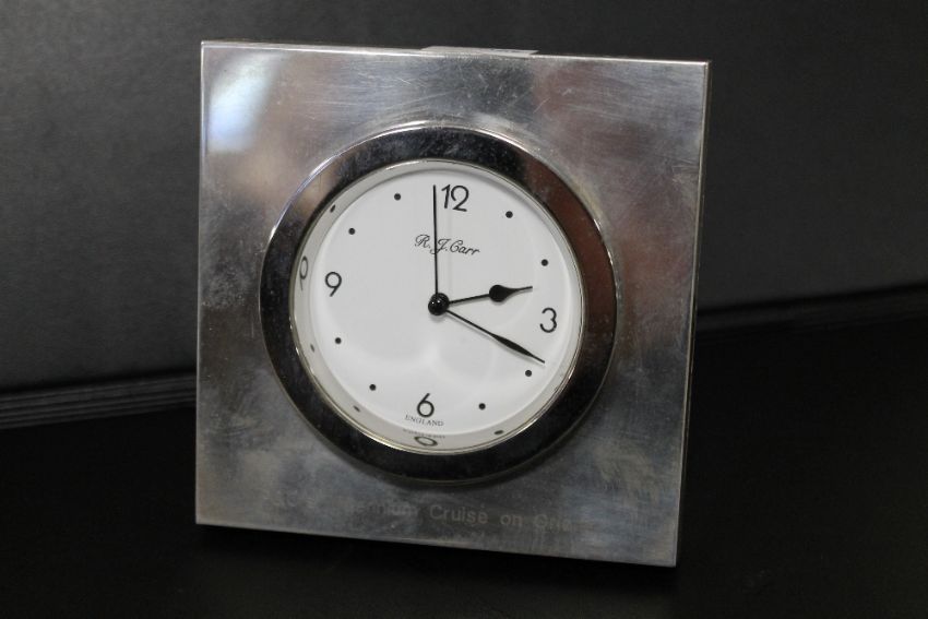 HALLMARKED SILVER R J CARR STRUT CLOCK, INSCRIBED 'P & O'S MILLENNIUM CRUISE ON ORIANA'