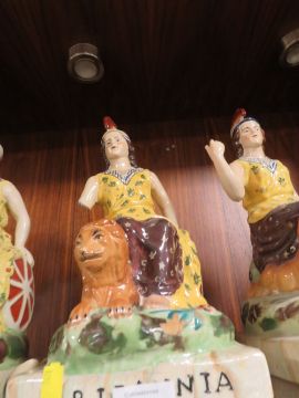 THREE REPRODUCTION STAFFORDSHIRE STYLE FIGURES OF BRITTANIA TOGETHER WITH A MAN PLAYING DRUMS ALL A/F