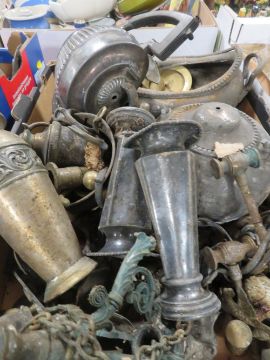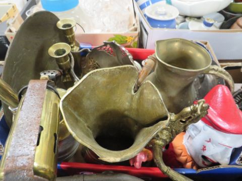 THREE TRAYS OF ASSORTED METAL WARE TO INCLUDE BRASS HORSES ETC