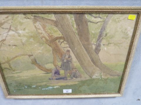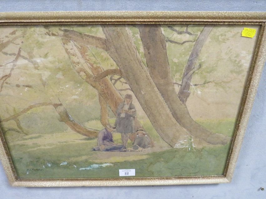 B.J. FLETCHER - A WATERCOLOUR DEPICTING THREE CHILDREN IN THE WOODS