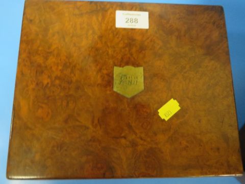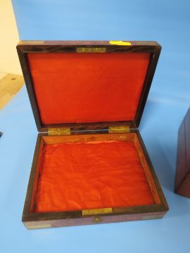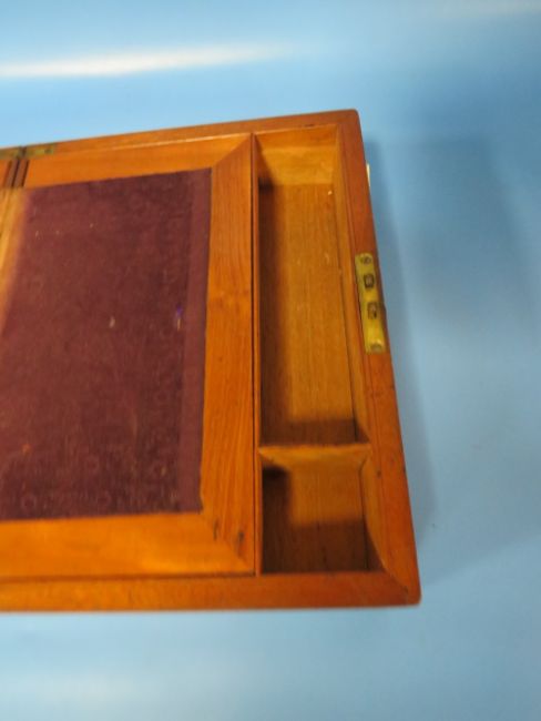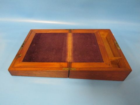 A BRASS BOUND WALNUT STYLE BOX TOGETHER WITH A SMALL WRITING SLOPE (2)