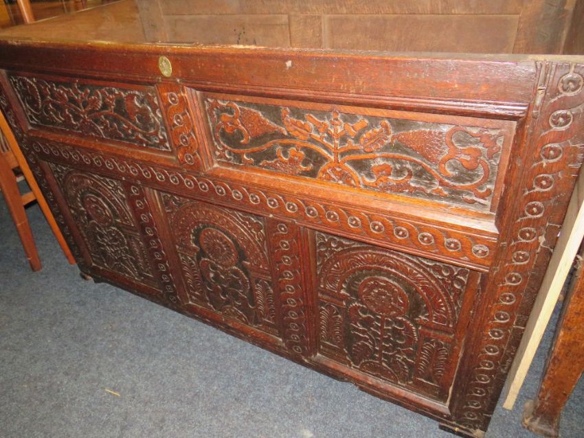 AN ANTIQUE OAK CARVED COFFER - W 13 cm