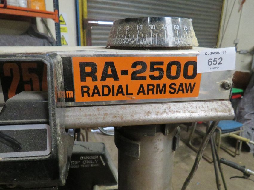 A RYOBI OVERHEAD RADIAL ARM SAW AND BENCH WITH STORAGE
