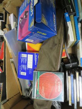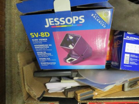 TWO TRAYS OF PHOTOGRAPH EQUIPMENT ETC TO INCLUDE PROJECTOR, PENTAX CAMERA AND LENS, SD CARDS ETC