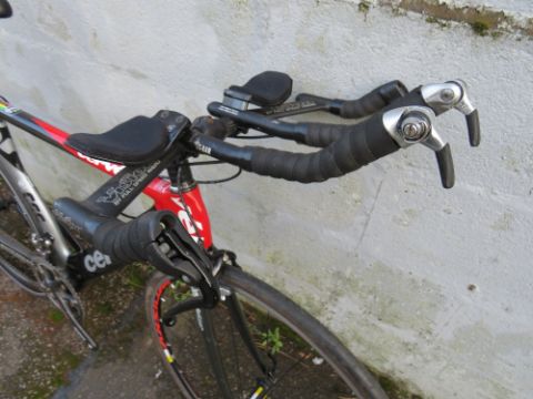 A CARBON FIBRE CERVELO P3C TT 20 SPEED RACING BICYCLE, WITH REAR HED WHEEL, MAVIC AKSIUM FRONT WHEEL, SL-K LIGHT CRANK AND DURA ACE DERAILLEUR, A VISION TRIATHLON HANDLEBARS