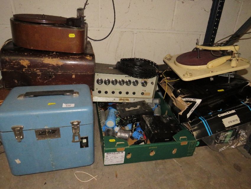 A SELECTION OF VINTAGE RECORD PLAYER, RADIO TRANSMITTERS, CAPACITORS, FIBRE OPTIC WELDER AND VIDEO EDITING EQUIPMENT PLUS A BRENEL REEL TO REEL TAPE RECORDER