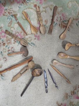 COLLECTION OF TREEN SPOONS, OCEANIC POLYNESIAN COCONUT SHELL SPOONS, AFRICAN TRIBAL ART ETC