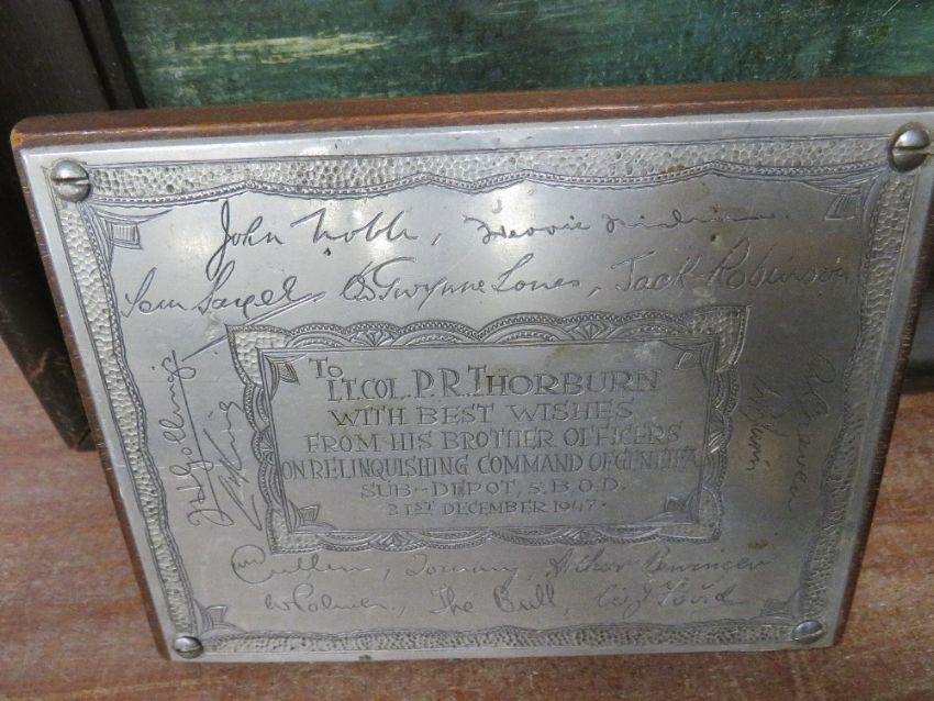 A VINTAGE OIL ON CANVAS EASTERN RIVER SCENE WITH BOATS AND BUILDINGS PRESENTED TO LT COLONEL P.R. THORBURN ON RELINQUISHING COMMAND OF GENEFICA SUB-DEPOT 5. B.O.D. 31st DECEMBER 1947 WITH PLAQUE (2)