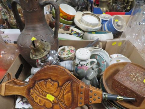 THREE TRAYS OF ASSORTED CERAMICS TO INCLUDE A LIDDED TG GREEN LUMPED SUGAR STORAGE JAR, TOGETHER WITH A TRAY OF GLASS WARE (4)