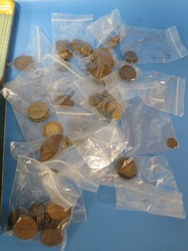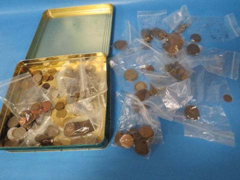 A TIN OF MAINLY BRITISH COINS, INCLUDING A SMALL QUANTITY OF SILVER THREEPENCES, A SMALL QUANTITY OF PRE-47 ISSUES, A 1763 THREEPENCE AND A CHARLES III 50P