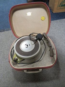A VINTAGE MCMICHAEL RADIO LIMITED BATMAN RADIO (UNCHECKED) TOGETHER WITH A CASED PORTABLE RECORD PLAYER IN THE FORM OF A SUITCASE FIDELITY