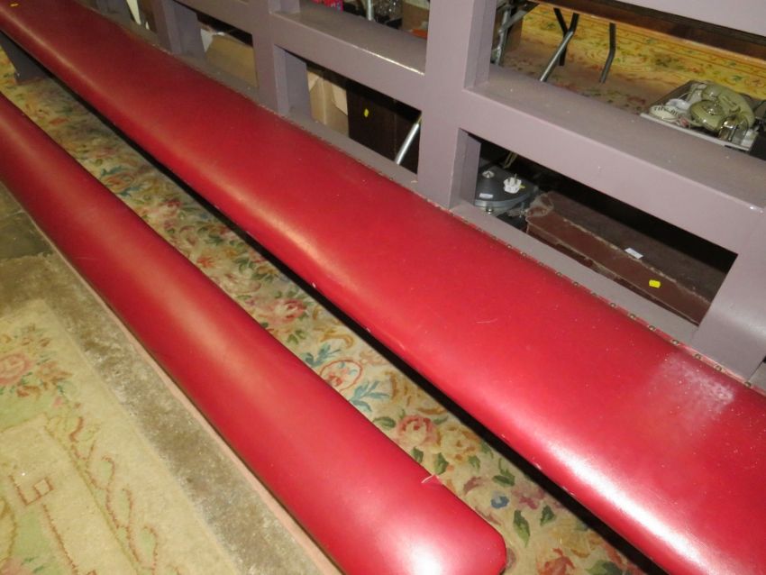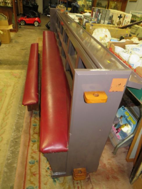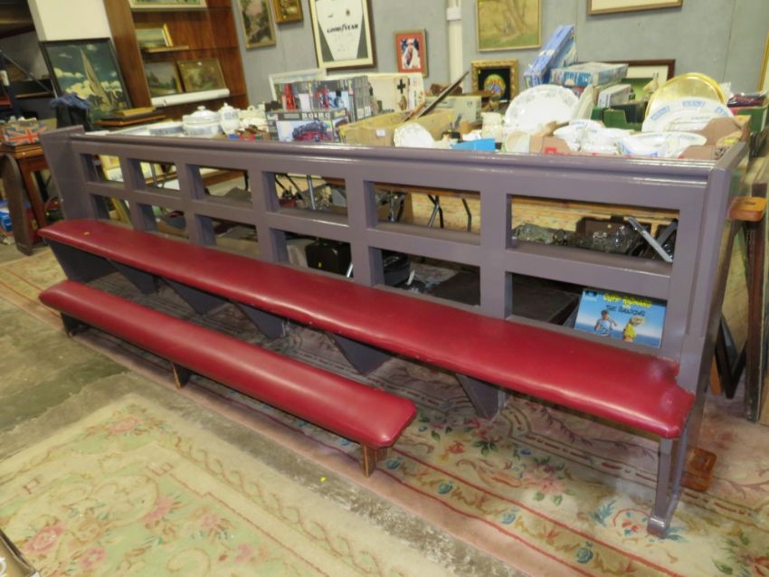 A LARGE PAINTED CHURCH PEW WITH A KNEELING BAR L-360 CM