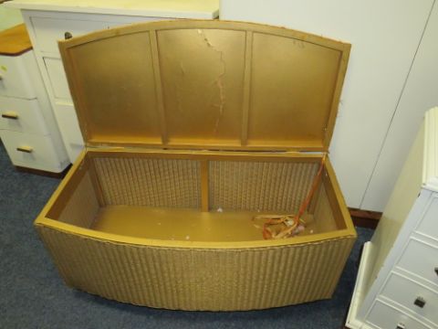 A WHITE PAINTED FOUR DRAWER SERPENTINE CHEST, COFFEE TABLE AND LLOYD LOOM LINEN BOX (3)