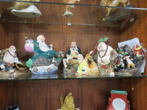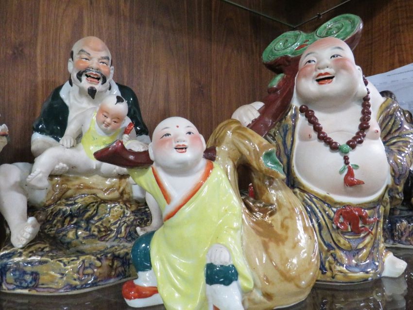 A COLLECTION OF FIVE ASSORTED LARGE ORIENTAL PORCELAIN FIGURES, each dressed in traditional dress, impressed marks, largest H 33 cm, W 31 cm