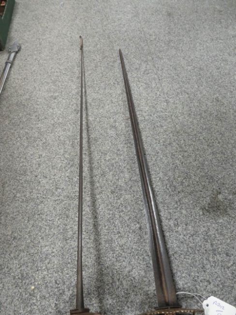 A RAPIER STYLE SWORD WITH HOLLOW TRIANGULAR FORM BLADE, with fancy cast hilt, along with a mortuary style basket hilt sword A/F, both probably late 19th early 20th century