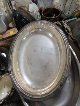 A TRAY OF ASSORTED METAL WARE TOGETHER WITH A TRAY OF CERAMICS