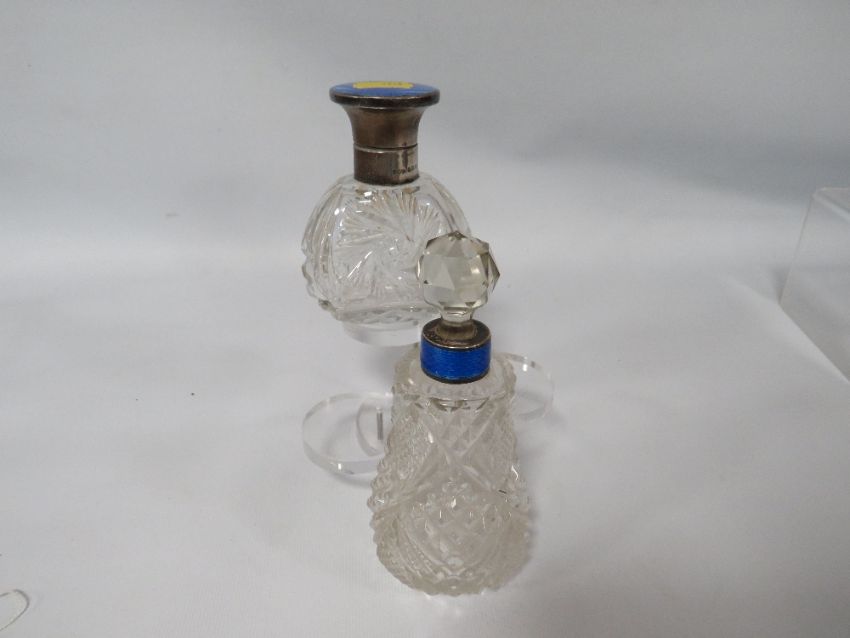 A HALLMARKED SILVER AND BLUE GUILLOCHE ENAMEL CUT GLASS SCENT BOTTLE TOGETHER WITH ANOTHER (2)