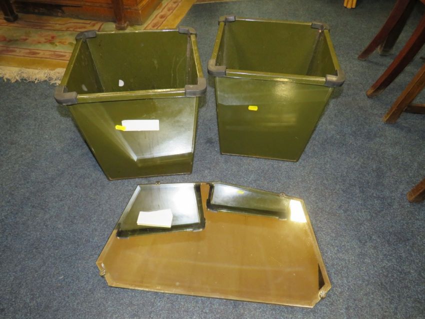 TWO VINTAGE METAL WASTE PAPER BINS AND A MIRROR