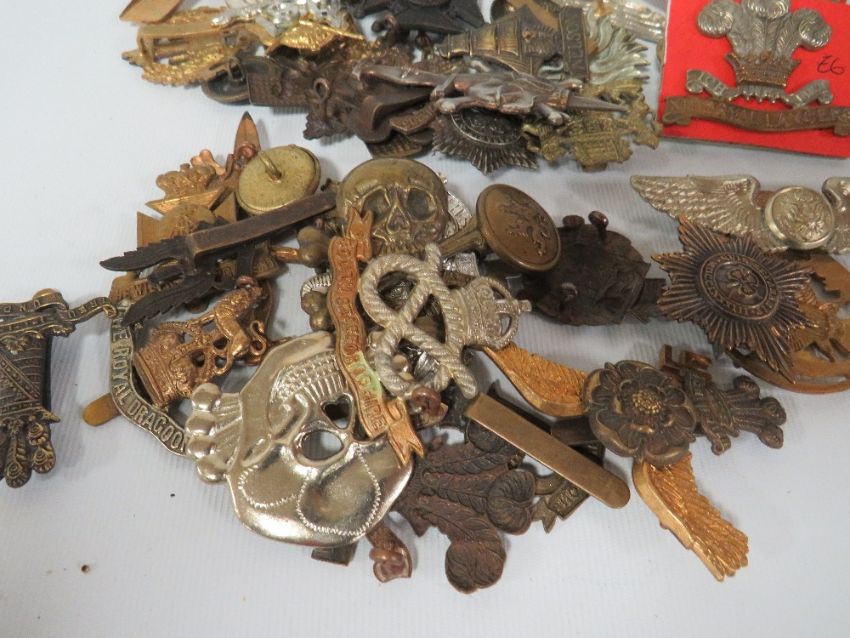 APPROX 40 MILITARY BADGES INCLUDING, LANCERS, DRAGONS AND COUNTY REGIMENTS