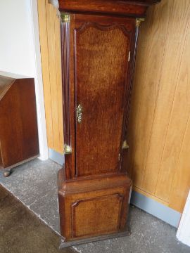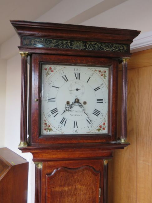 A GEORGE III 8 DAY LONGCASE CLOCK BY JOSEPH WALKER- NANTWICH, the oak case having a painted hood frieze and reeded columns, dial plate measuring 13", painted white with floral spandrels and steel cut filigree hands, H 198 cm