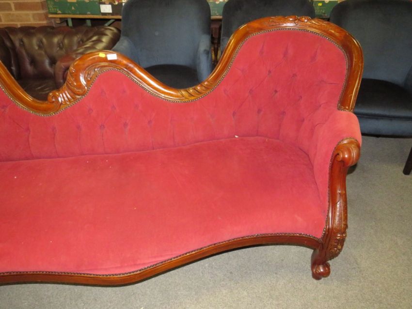 A REPRODUCTION MAHOGANY SHAPED UPHOLSTERED SETTEE