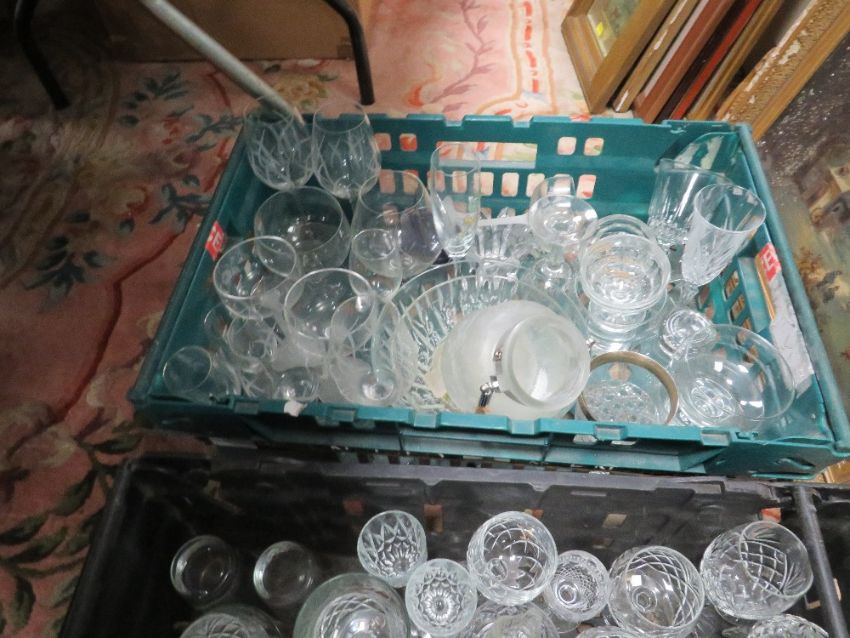 THREE TRAYS OF ASSORTED GLASS WARE TO INCLUDE CUT GLASS DRINKING GLASSES, VASES ETC