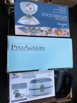A TRAY OF ODDMENTS TO INCLUDE UTEN DIGITAL ULTRASONIC CLEANER, boxed Cofton kitchen scales, boxed Pro Action shredder and an unboxed electrical heat and eat mug
