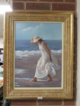 A MODERN FRAMED OIL ON CANVAS DEPICTING A LADY ON THE BEACH - SIGNED