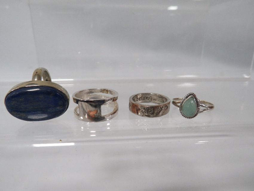 FOUR DECORATIVE SILVER DRESS RINGS TO INCLUDE A SPILT STYLE EXAMPLE