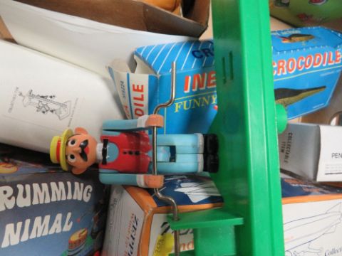 A TRAY OF ASSORTED VINTAGE AND MODERN TOYS, TIN PLATE MOTORCYCLE WITH SIDE CAR, REMOTE HELICOPTER ETC