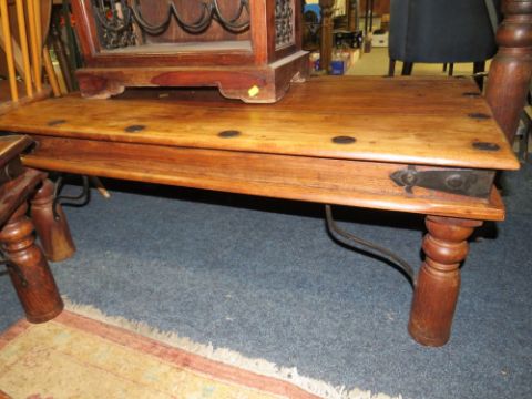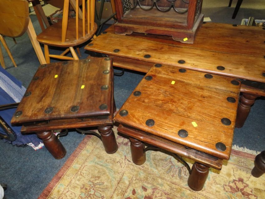 A COLONIAL STYLE HARDWOOD COFFEE TABLE, WINE RACK AND 2 LAMP TABLES