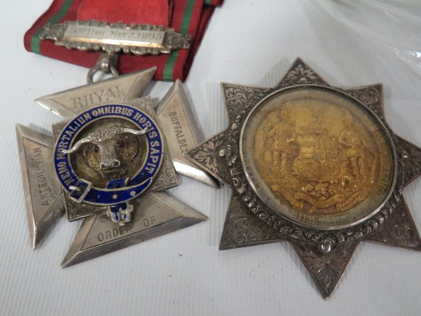 A 19TH CENTURY ANCIENT ORDER OF FORESTERS GLAZED SILVER SASH STAR MEDAL AND SASH, PRESENTED TO P.C.R JOHN SUTTON, JUNE 1867 A LATE 19TH CENTURY SILVER "RAOB" (BUFFALO'S) " SIR JOHN FALSTAFF LODGE " JEWEL. PRESENTED TO FRED SUTTON, DECEMBER 1894 ,A LARGE LATE 19TH CENTURY SILVER "RAOB" (BUFFALO'S) JEWEL WITH BARS. PRESENTED TO FRED JOHN SUTTON BY MEMBERS OF THE WANDERERS LODGE. MAY 1895
