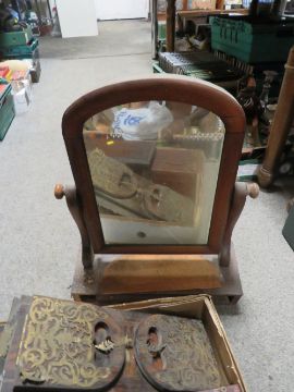 A TRAY OF ASSORTED TREEN TO INCLUDE A BOOK SLIDE, TOGETHER WITH ANOTHER TRAY TO INCLUDE A MIRROR ETC