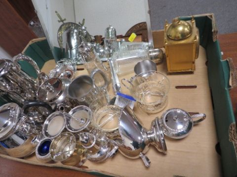 A TRAY OF ASSORTED SILVER PLATE AND METAL WARE TO INCLUDE A BRASS EFFECT CLOCK