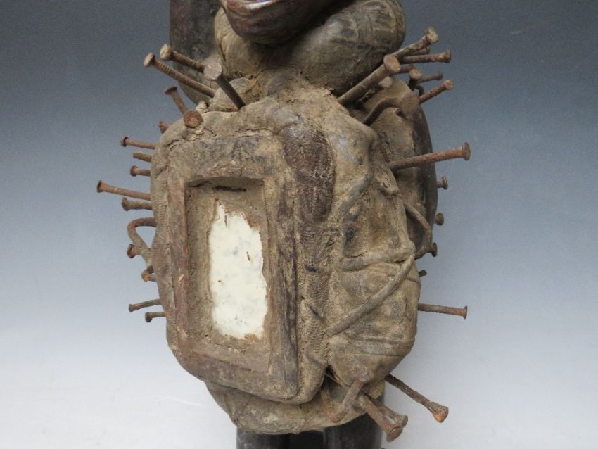 A KONGO POWER FIGURE BRANDISHING AN IRON SPEAR WITH INSET GLASS EYES AND A PANEL TO HIS ABDOMEN, H 48 cm