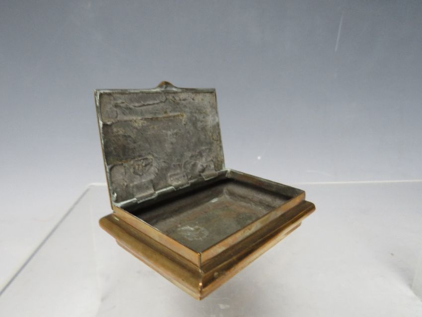 A VICTORIAN BRASS TABLE SNUFF BOX, with Prince of Wales armorial, 5.5 cm x 8 cm