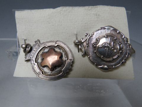 A CASED SILVER SWIMMING MEDAL - CHESTER 1934, together with two hallmarked silver fobs (3)