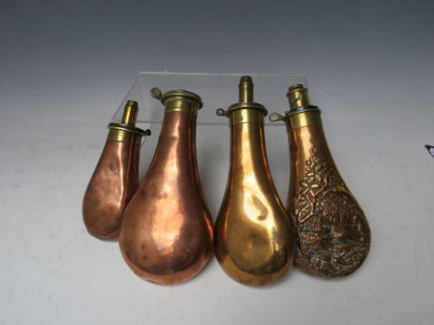 FOUR 19TH CENTURY COPPER POWDER FLASKS, average L 20 cm