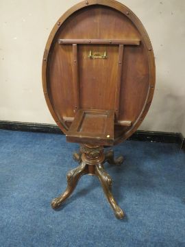 A VICTORIAN WALNUT TILT-TOP LOO TABLE, the quarter veneered top having original snap lock mechanism, raised on a carved turned support and four legs, W 134 cm S/D