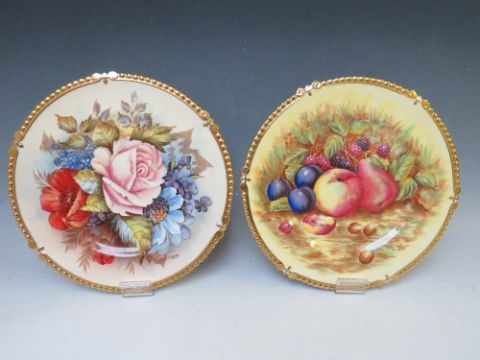 A NEAR PAIR OF AYNSLEY CABINET PLATES SIGNED J.A. BAILEY AND N. BRUNT, the Bailey plate with flowers and the other fruit, Dia. 27 cm (2)
