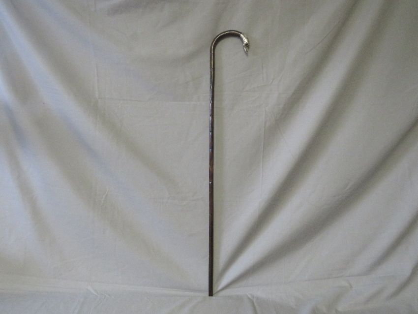 A LATE 19TH / EARLY 20TH CENTURY WALKING STICK WITH HALLMARKED SILVER MOUNTED HANDLE - BIRMINGHAM 1909, the handle designed in the shape if a greyhound head in profile, L 93 cm