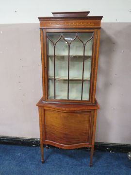 AN EDWARDIAN MAHOGANY INLAID DISPLAY CABINET, the serpentine fronted lower section with single door, the upper section having a single astragel glazed door, H 202 cm, W 76.5 cm