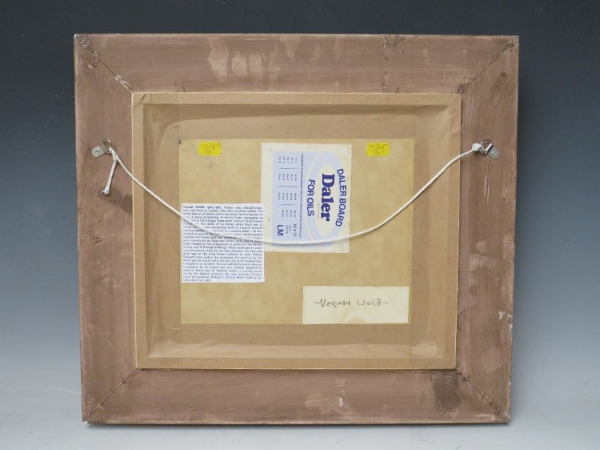 VERNON WARD (1905-1985). Winter lakeside scene with swans and ducks, signed on label verso, oil on canvas board, framed, 24 x 30 cm